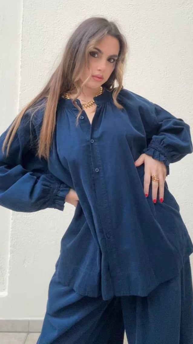 Coordinato in velluto a costine , camicia con collo a giro , chiusura cn bottoni