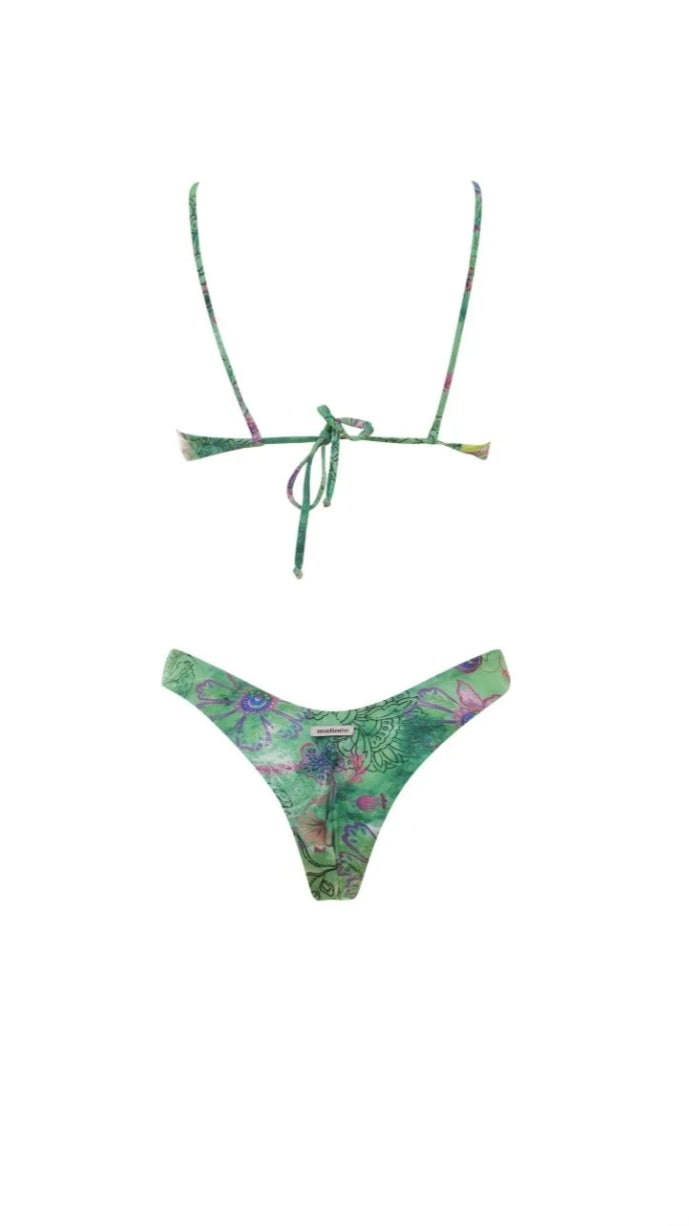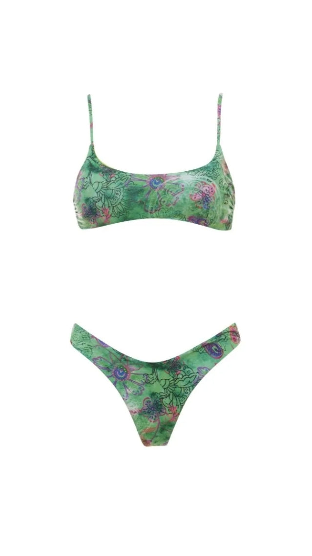 Dora è il bikini che combina un top a fascia con imbottitura estraibile e bretelle regolabili, e uno slip a brasiliana con taglio a V. La chiusura del top è regolabile, grazie ai laccetti annodabili, per garantirti il massimo della personalizzazione. In fantasia bohemia di colore verde. Realizzato in microfibra, un tessuto leggero e resistente, perfetto per costumi da bagno confortevoli..