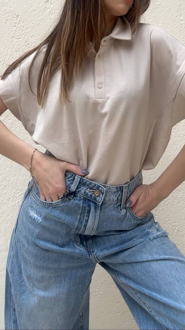 Denim chiaro modello baggy con strappi , chiusura con bottone e cerniera ,