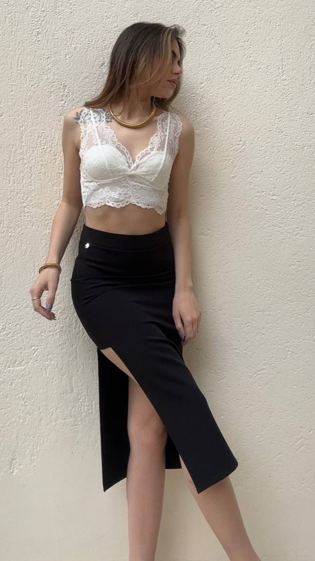 Gonna corta elasticizzata, chiusura con cerniera sul retro, ampio spacco laterale squadrato