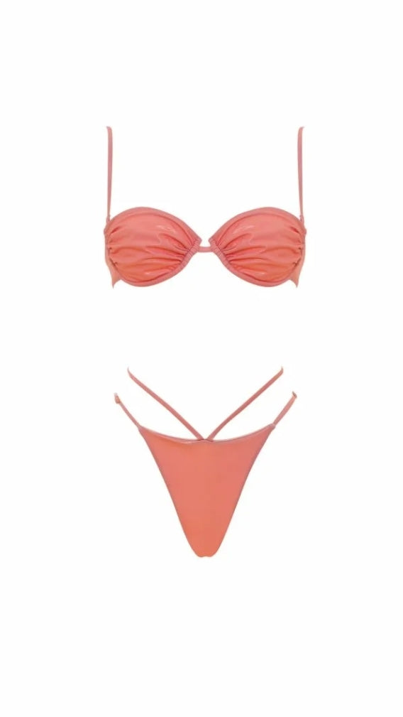 Marina è il bikini bestseller dell’estate, per uno stile impeccabile e luminoso. Combina un top dalla vestibilità slim, con ferretto senza imbottitura e bretelle regolabili e removibili, che ti permette di adattarlo alle tue necessità. E uno slip sgambato con arricciatura e doppio laccetto. La chiusura del top è con clip, sicura e comoda. In tinta unita, nella colorazione pesca. Realizzato in lamina, un materiale riflettente che aggiunge un tocco glamour ai costumi da bagno. Istruzioni per la cura: Lavare a mano in acqua fredda.