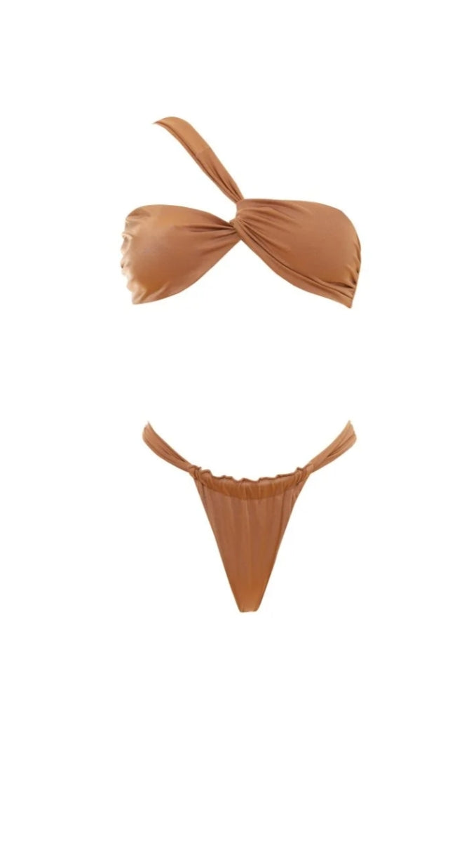 Mila è il bikini particolare e ricercato composto da un top monospalla con intreccio sul davanti e uno slip a vita bassa con sgambatura a brasiliana. Il top è dotato di coppa estraibile per garantirti flessibilità e comfort e la sua chiusura è a clip, comoda e sicura.