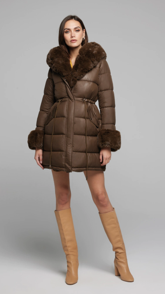 Inserto pelliccia su tutta la lunghezza e sui polsi , completamente smontabile , laccetti in vita per restringere